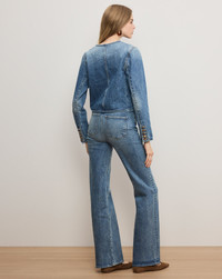 Product details A cool and casual take on the classic lady jacket. Expertly tailored from luxe Italian denim in a classic blue wash, the Andrea features a boxy, cropped fit and a clean, collarless design. Front patch pockets and statement cabochon buttons complete the look. Pair with jeans for an elevated take on the Canadian tuxedo. - 100% Cotton - Made in LA from premium Italian denim - Turn inside out and wash in cold water. Hang dry. - Style #J25089380156FN