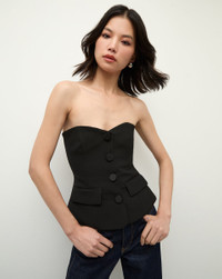 Product details Expertly tailored in the US, the Arlette is defined by a strapless silhouette and sculptural fit. A sweetheart neckline and peplum further the flirty and feminine appeal. Add a jacket and pants for day; wear solo over jeans at night. - 63% Polyester, 27% Viscose, 7% Cotton, 3% Elastane - Lining: 100% Polyester - Made in USA - Dry clean only - Style #2410SU00240630