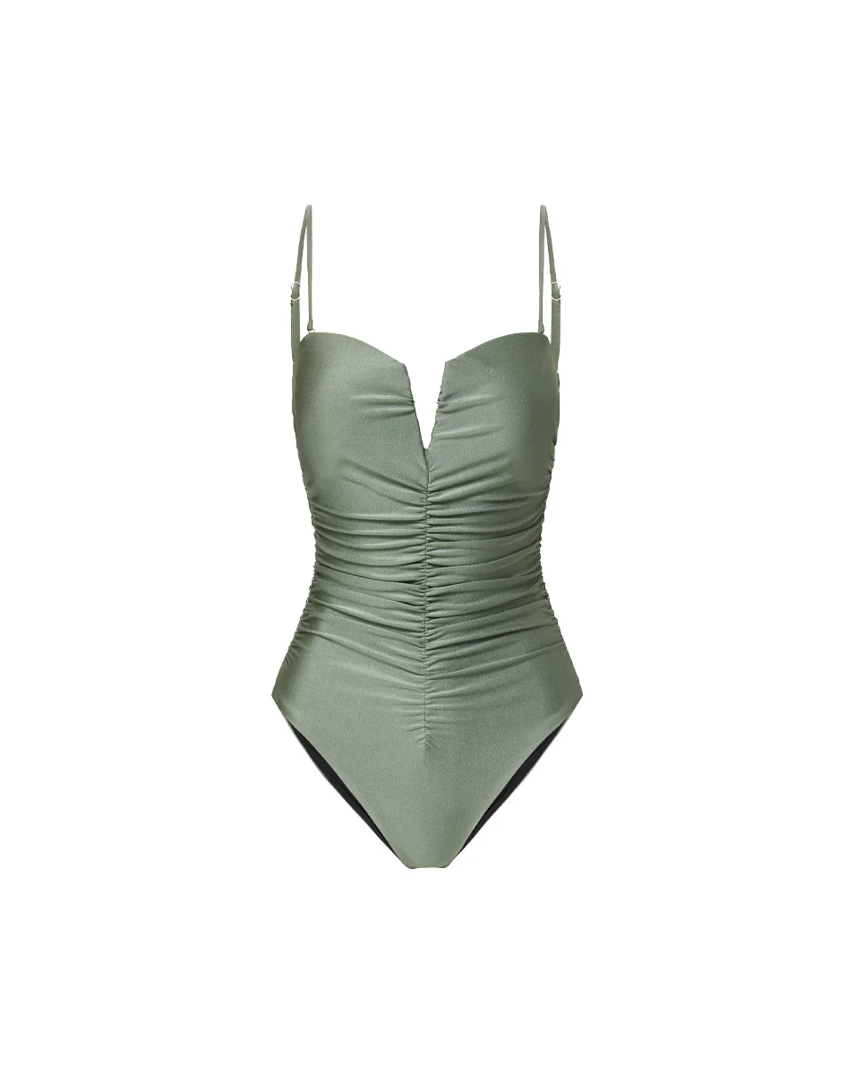 Product details Our signature ruching defines the Arpel swimsuit—a flattering, feminine one-piece bathing suit. Padding at the bust provides support that shapes and flatters while the split-V detail adds a sexy peekaboo factor. Pro tip: Style as a bodysuit and pair with jeans for a quick and versatile vacation hack. Available in black, light blue, and army green. - 80% Polyamide, 20% Elastane - Lining: 82% Polyamide, 18% Elastane - Made in USA - Machine wash cold and hang to dry. Do not iron, bleach or dry clean. - Style #2505SW1300213