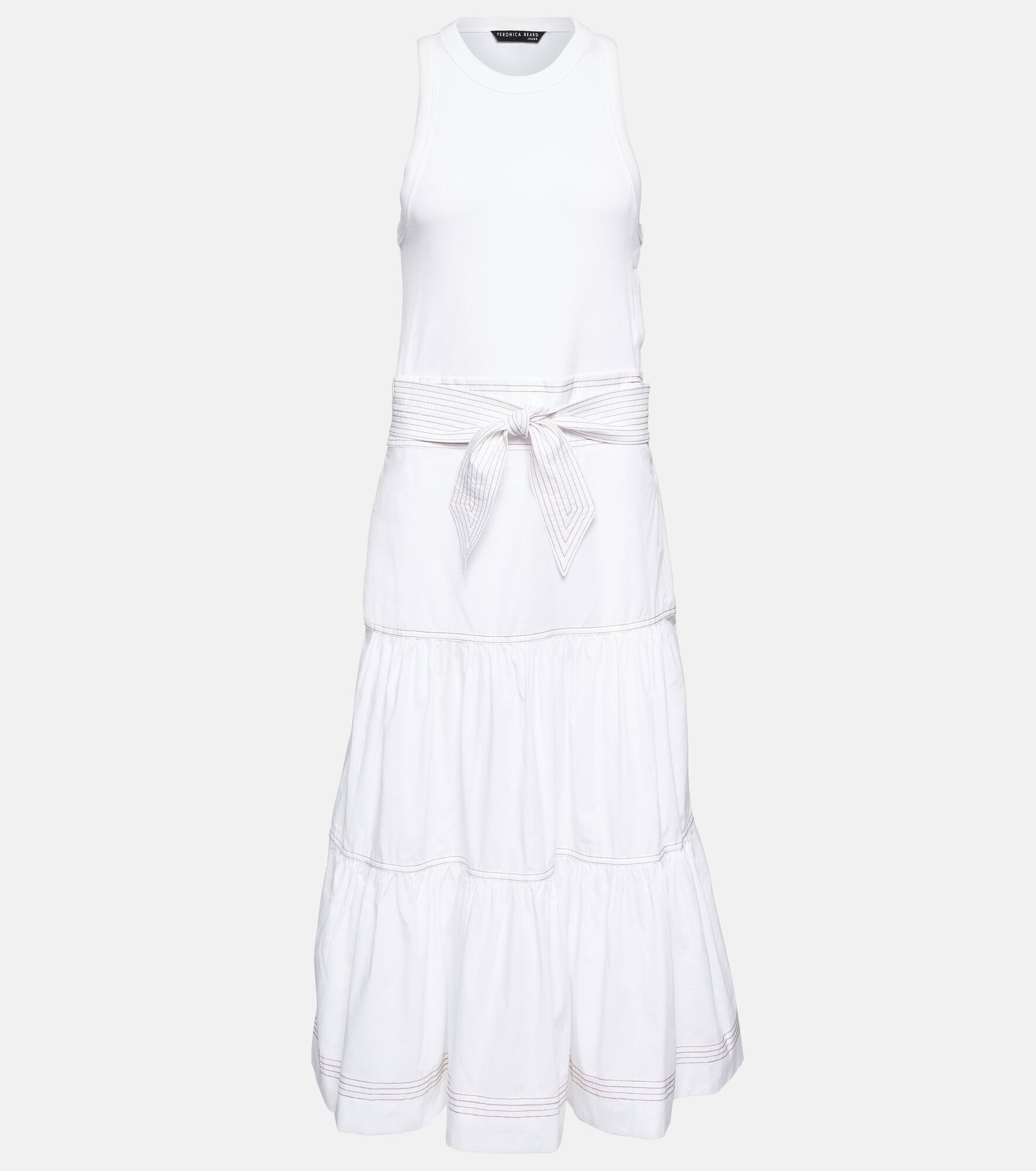 The Austyn maxi dress from Veronica Beard pairs together a tiered maxi skirt with a ribbed tank. The multimodal design is accented by contrast stitching and a tie at the waist for added definition. Product Details - Care instructions: machine wash at 30 degrees - Material: 97% pima cotton, 3% elastane - Self-tie belt - Designer color name: White - Made in Peru - Item number: P00800498 Size & Fit - True to size - Adjustable at the waist - Relaxed fit from the hip down - Mid-weight material - The model seen in the picture is 178cm-5'10" and wearing a size XS