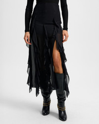 Product details The perfect blend of romance and drama. Crafted from sheer premium silk, the Ava features a cascading, ruffled maxi silhouette, complete with a built-in mini slip for ease. A handkerchief hem and front slit add movement and a flirty edge. Pair with a sleeveless turtleneck top for a sleek look, or layer under an oversized sweater for something more relaxed. - 100% Silk - Lining: 100% Polyester - Dry clean only - Style #2509CH3830641