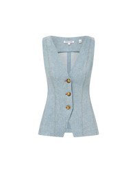 Product details A casual take on a tailoring favorite. Our sleeveless Avalina vest is expertly crafted from thick stretch-cotton denim for flattering structure, featuring a deep V-cut and angled cutaway hem. Darting and angled seams highlight the waist, while tortoise buttons and paneled topstitching complete the look. Pair it with the coordinating Hawthorne pant for a fresh take on the Canadian tuxedo. - 98% Cotton, 2% Elastane - Dry clean only - Style #2507NV23B0203