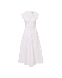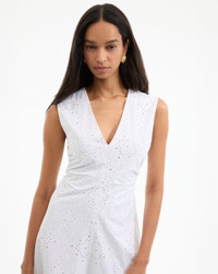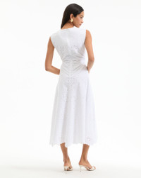 Product details Expertly tailored from lightweight cotton, the white Aven midi dress is defined by a charming allover eyelet design. A chic summer-ready dress, it features cap sleeves, a V neck, and slight ruching at the sides for waist definition. An effortless summer go-to, this can easily be dressed up or down—add flats for day, heels, and jewelry at night. - 100% Cotton - Lining: 100% Cotton - Dry clean only - Style #2504EM7821664