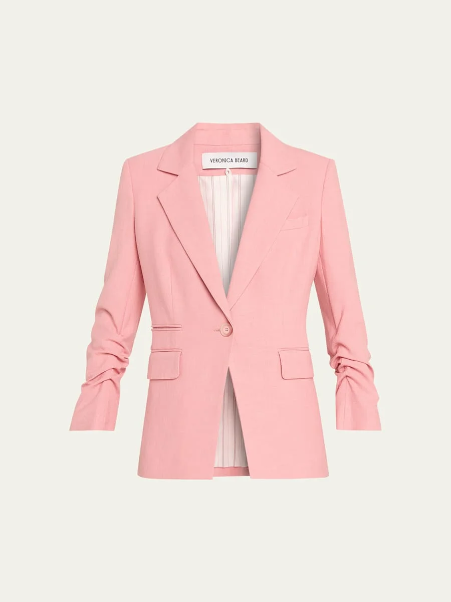 Veronica Beard "Battista" dickey jacket finished with a singlebreasted front Compatible with Veronica Beard dickey's (sold separately) Notch lapels Ruched sleeves with button cuffs Welt and flap pockets Tailored fit Cutaway hem Back vent Buttonfront Viscose/elastane Dry clean Made in USA