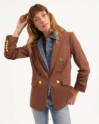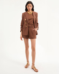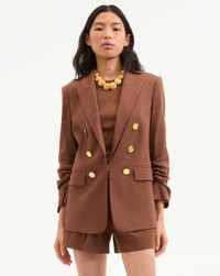 Product details Expertly tailored from Italian stretch linen, the brown Beacon dickey jacket is an elongated, classic-fit silhouette defined by gathered sleeves for a pre-styled look. Hammered gold buttons complete the effortlessly cool look. Wear it with jeans and heels for our tried-and-true VB uniform—and switch it up with a dickey for even more styling options. - 55% Linen, 44% Viscose, 1% Elastane - Lining: 95% Polyester 5% Elastane Fabric country of origin: Italy - Dry clean only, with buttons covered - Style #2504LN331466
