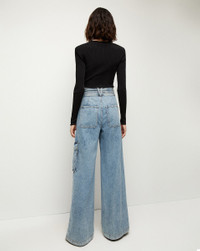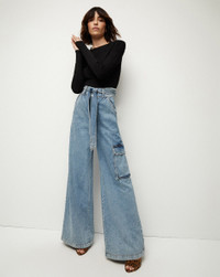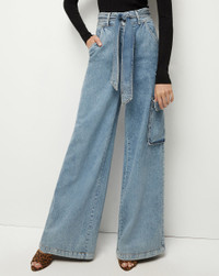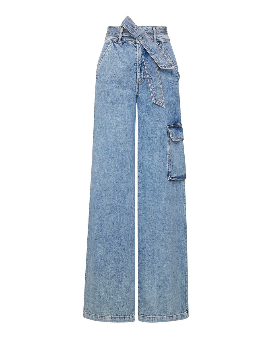 The classic cargo jean—but cooler. Meet Belisa, a dramatic wide-leg style with a removable sash at the waist. An oversized cargo pocket on one side adds a chic utilitarian element, while the classic light wash makes it supremely versatile. To heighten the statement-making factor, pair with a top in a matching color for an entrance-making monochrome look. DETAILS & FIT - 100% Cotton - Rise 12.5" | Inseam 34" | Leg opening 27", based on a size 26 - Our model is 5'10" and is wearing a size 26 - Premium Turkish denim - Made in LA - Machine wash cold - Style #J23117571177SI - Rigid - Comfort Stretch - Stretch
