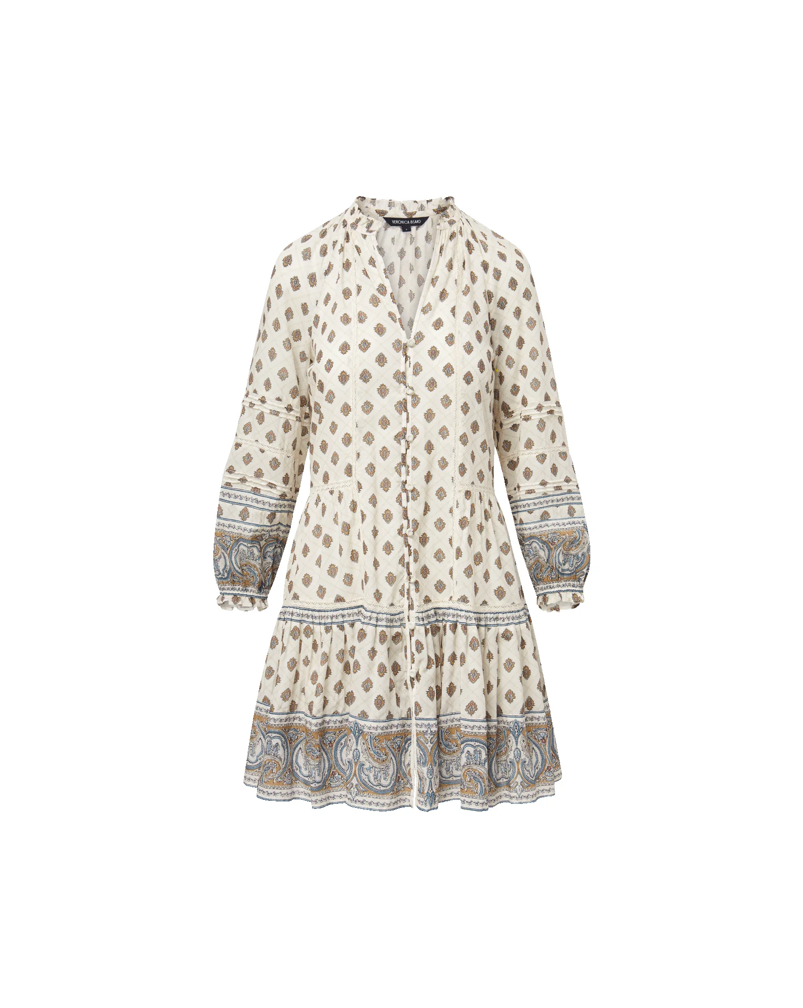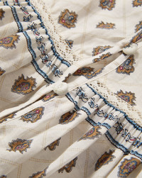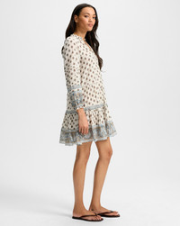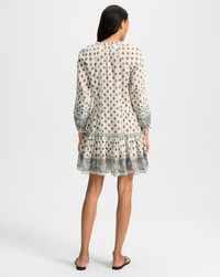 Product details Bohemian ease. Crafted from premium stretch cotton, the Belissa dress features a breezy tent silhouette with blouson sleeves and a charming flounce at the bottom. Tight ruffles at the neckline and cuffs add romance while an engineered print mixes pretty paisleys and a geometric tile pattern. Perfect for weekend and wanderlust—just add sandals and go. - 58% Cotton, 42% Viscose - Lining: 100% Cotton - Closure: Button and loops - Dry clean only - Style #J2506VO2721801