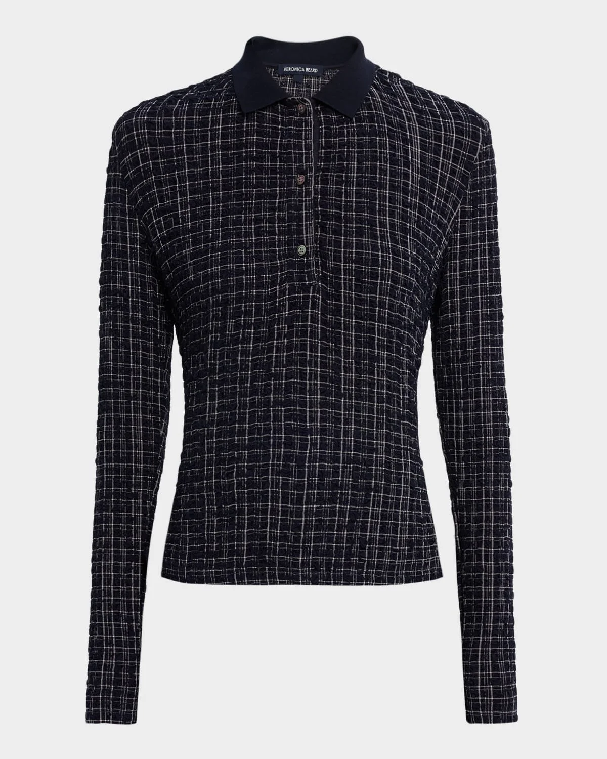 Crafted from a premium stretch blend, the "Benedetta" top by Veronica Beard boasts a textured plaid motif finished with solid trim for a comfortable yet chic look. Spread collar; buttonplacket Long sleeves Slim fit Hem sits at the hip Pullover style Viscose/polyester/elastane Dry clean Imported