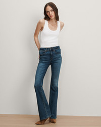 Product details In a classic blue wash, the Beverly jean features a high-rise waist that is fitted through the hips and thighs with a subtly flared leg. High quality stretch denim offers a flattering look with a flexible fit. Tuck in any of our tops and add sky-high heels for an elongating silhouette. - 92% Cotton, 6% Elastomultiester, 2% Elastane - Made in LA from premium Italian denim - Turn inside out and machine wash on cold. Hang to dry - Style #J21084850644BB
