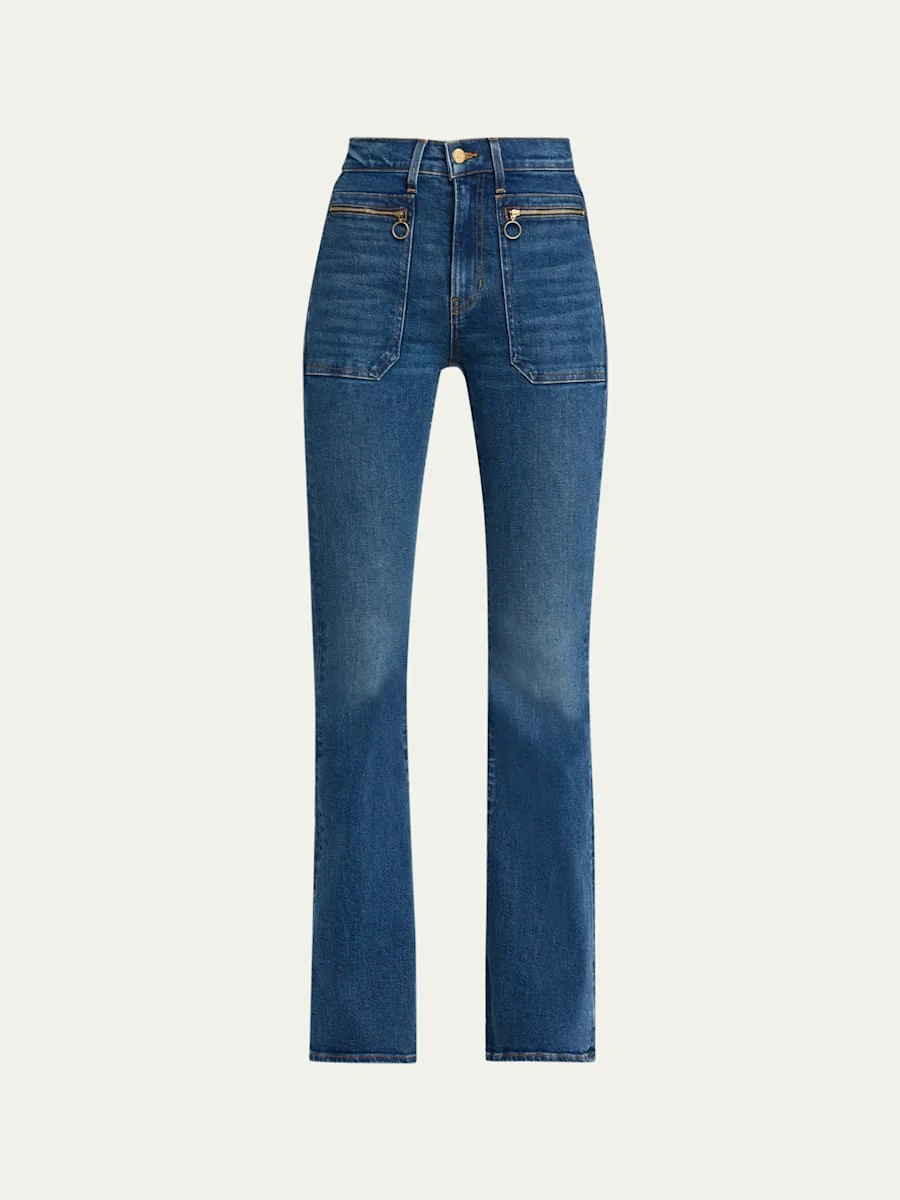 Veronica Beard "Beverly" skinnyflare jeans accented with front zip pockets, cut from superstretch denim Approx. 11" rise; 34" inseam High rise Front and back patch pockets Slim fit Full length Button/zip fly; belt loops Cotton/elastane Machine wash cold, inside out Made in USA from imported materials SIZE amp; FITModel measurements: 5'10" tall Model is wearing a US size 4/Small