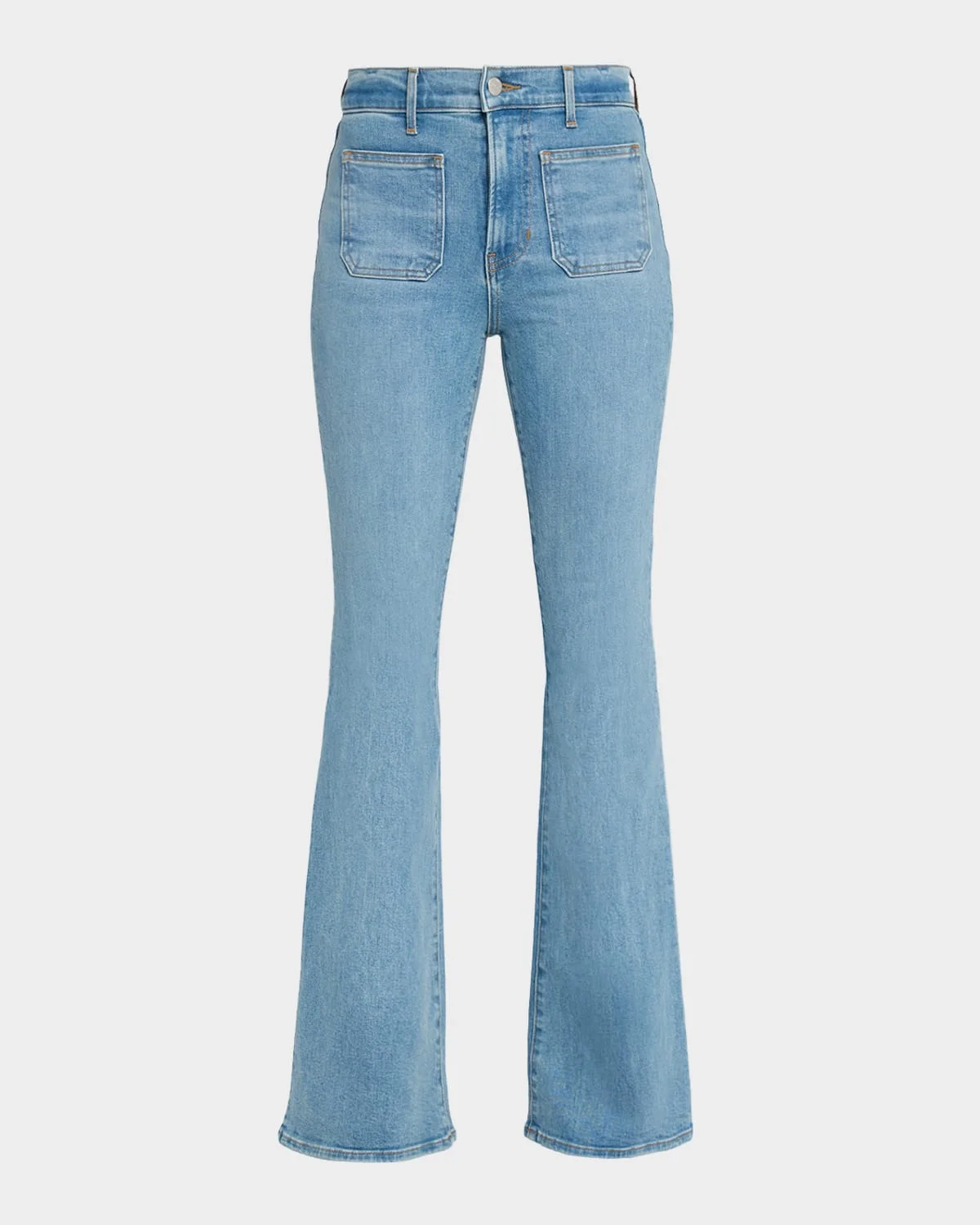 Veronica Beard "Beverly" flare jeans crafted from comfort-stretch denim Approx. 11" rise; 34" inseam & nbsp; High rise Front and back patch pockets & nbsp; Slim fit Full length Button/zip fly; belt loops Cotton/elastance Machine wash cold Imported SIZE & FITModel measurements: 5 & apos;10" tallModel is wearing a US size 4/Small