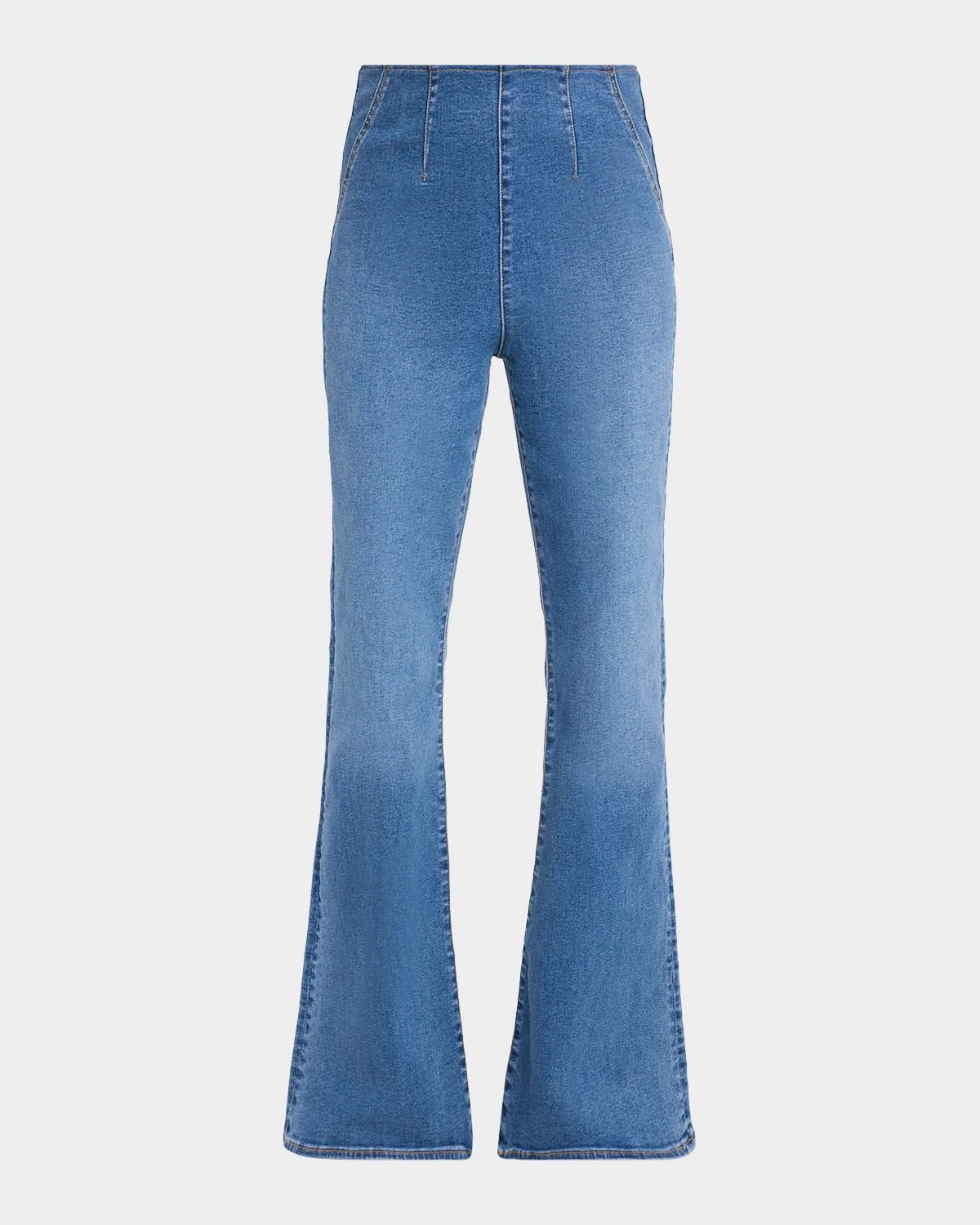 Veronica Beard "Beverly Off-Duty" flare & nbsp;jeans crafted from super-stretch denim & nbsp; High rise Elasticized waistband & nbsp; Flat front & nbsp; Side slash pockets Fitted through the hip and thigh Full length & nbsp; Pull-on style & nbsp; Cotton/polyester/elastane Machine wash cold, inside out Imported SIZE & FITModel measurements: 5 & apos;10" tallModel is wearing a US size 4/Small