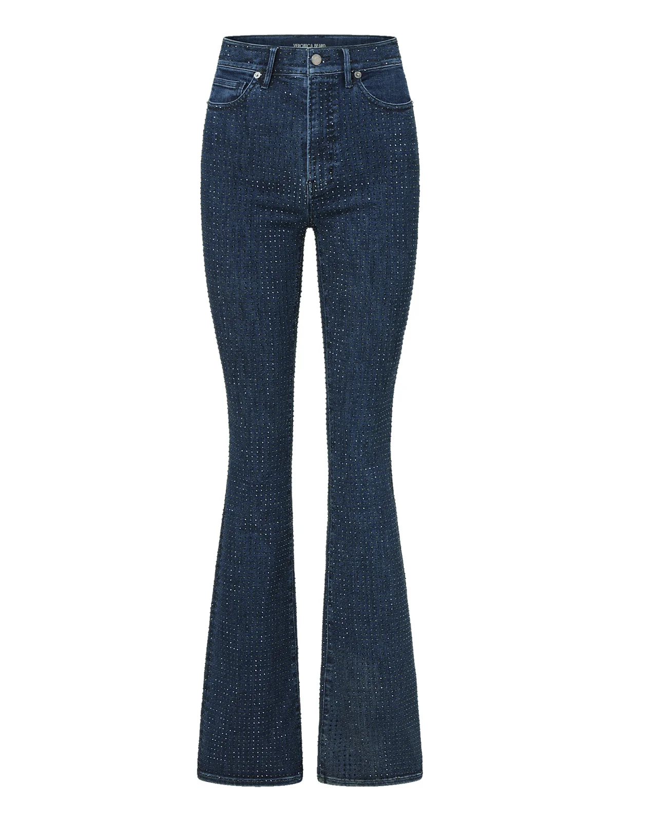 Product details Our best-selling Beverly jean—now in a deep indigo wash, embellished with all-over rhinestones. Still featuring the high-rise waist and subtly flared leg you know and love, this silhouette is fitted through the hips and thighs for a flattering shape and a legs-for-days effect. The rhinestone detailing makes a bold statement, perfect for dressing up. Tuck in any of our tops and add sky-high heels for an elongating, head-turning look. - 86% Cotton, 10% Polyester, 4% Spandex - Turn inside out and machine wash cold. Hang to dry. - Style #J2509D180644ID