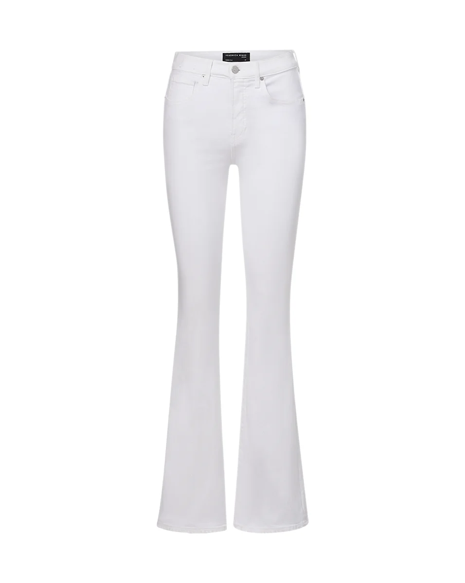 In our fresh white wash, the Beverly jean features a high-rise waist that is fitted through the hips and thighs with a subtly flared leg. High quality stretch denim offers a flattering look with a flexible fit. Tuck in any of our tops and add sky-high heels for an elongating silhouette. - 91% Cotton, 7% Polyester, 2% Elastane - Made in LA from premium Japanese denim - Turn inside out and machine wash on cold. Hang dry. - Style #J2411D230644WHI