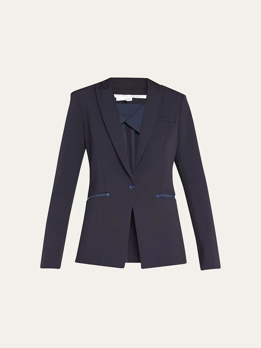 Veronica Beard jacket in bistretch scuba. Approx. 26"L down center back. Notched collar; single snap front. Long sleeves; foursnap cuffs. Princess seams on front. Welt pocket at chest. Zip pockets at waist. Straight vented hem. Polyester/spandex. Dry clean Made in USA of Italian material.