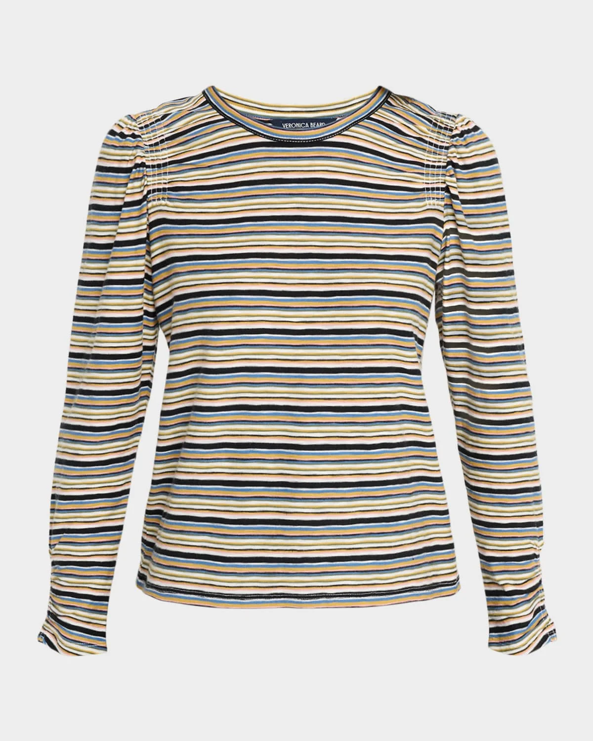 Veronica Beard "Bouvet" striped ultra-soft jersey tee detailed with shirring for a modern touch & nbsp; Crew neckline Long sleeves Classic fit Hem sits at the hip Pullover style & nbsp; Cotton Machine wash cold Made in Peru SIZE & FITModel measurements: 5 & apos;10" tallModel is wearing a US size 4/Small