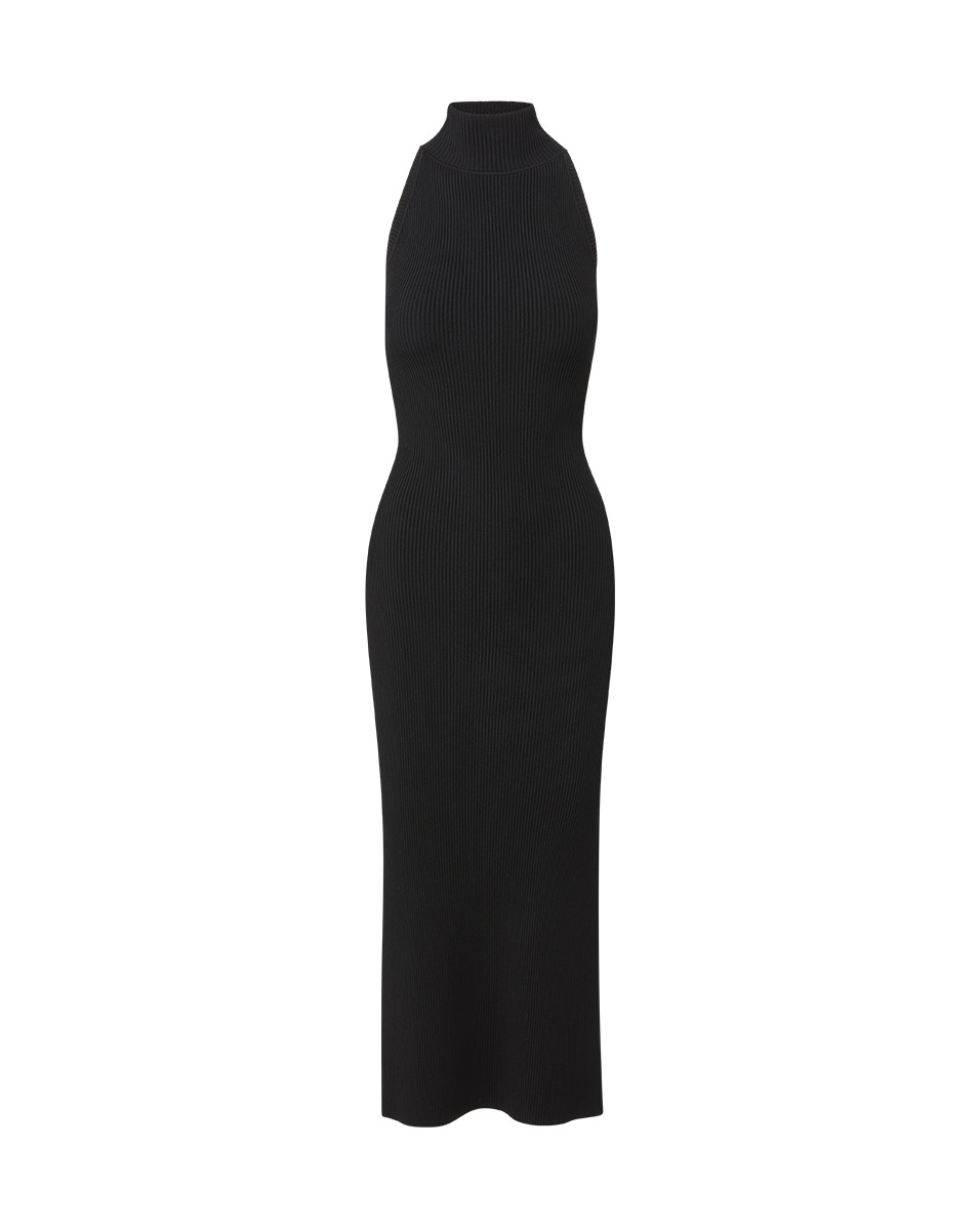 Product details The ease of a knit in an elegant LBD. Spun from an exceptionally soft stretch knit, the Briggita maxi dress is defined by a turtleneck halter and a body-skimming silhouette. Lean into the minimalist look with a simple heel—or use it as a canvas to pile on bangles and statement earrings. - 83% Viscose, 17% Polyester - Dry clean only. Do not hang. - Style #2411KS1221321