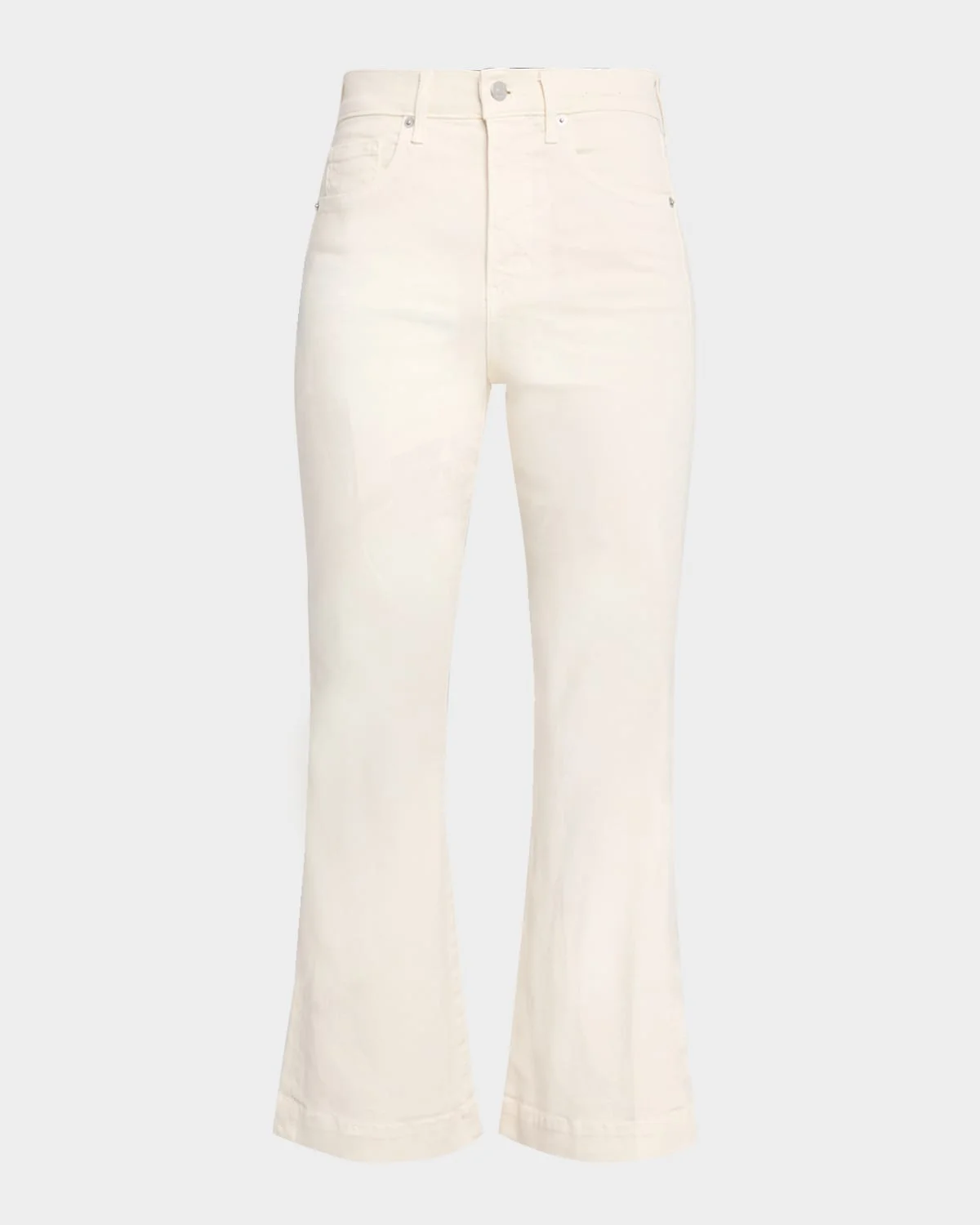 Veronica Beard Jeans "Carson" flared jeans in crisp white denim Approx. 11.5" rise; 28" inseam High rise Fivepocket style Fitted through the hip and thigh Ankle length Button/zip fly; belt loops Cotton/polyester/polyurethane Machine wash cold Made in USA
