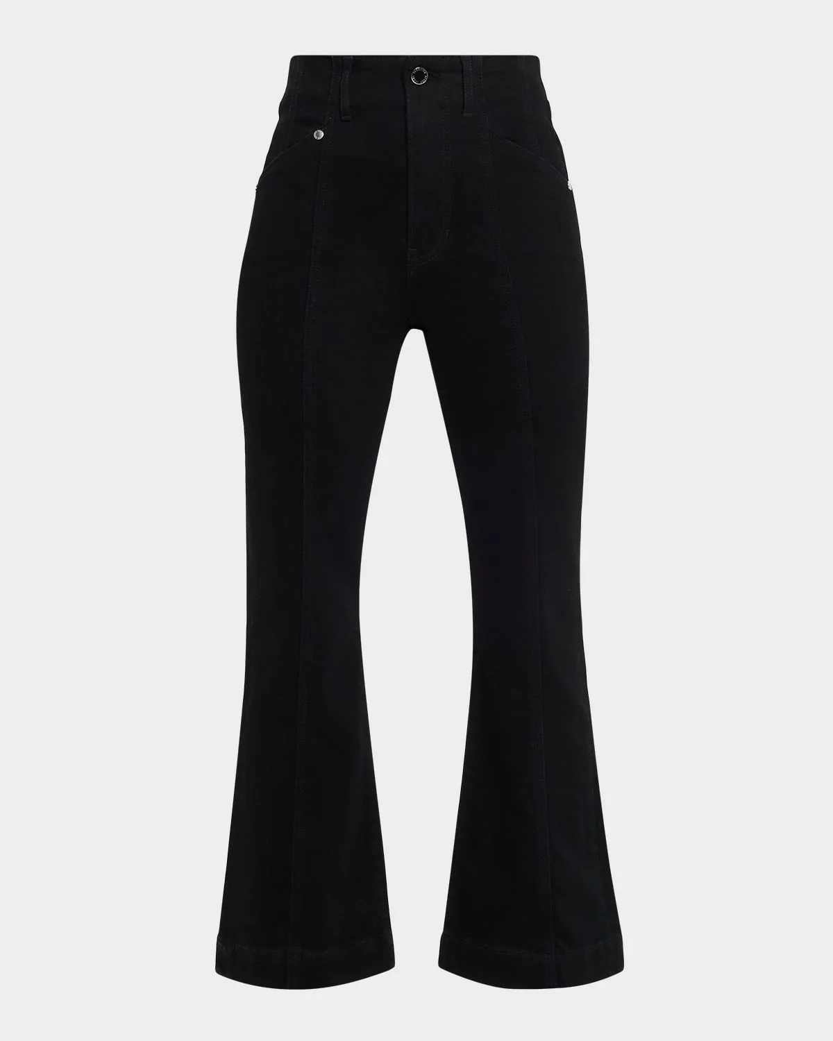 Veronica Beard "Carson" flared jeans in black stretch denim Approx. 11.5" rise; 28" inseam High rise Front slip pockets; back patch pockets Fitted through the hip and thigh Ankle length Button/zip fly; belt loops Cotton/polyester/elastane Machine wash cold Made in USA