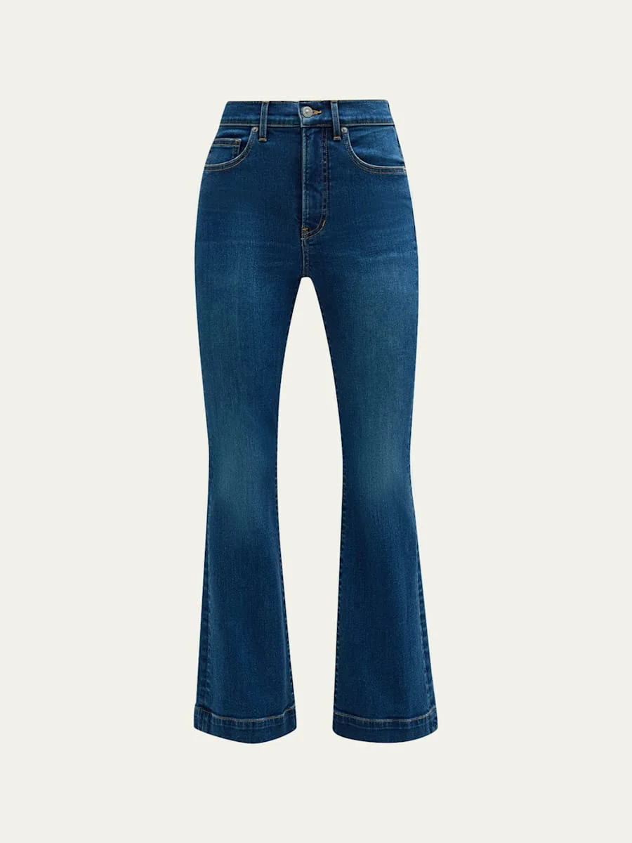 Veronica Beard Jeans "Carson" flaredleg jeans in mediumwash denim Approx. 11.5" rise; 28" inseam Midrise Fivepocket style Fitted through the hip and thigh Ankle length Button/zip fly; belt loops Cotton/elastane Machine wash cold Made in USA