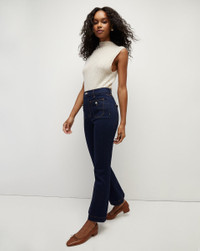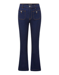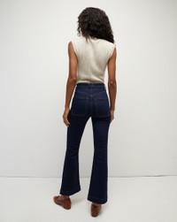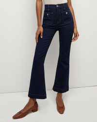 The Carson jean, now updated with patch pockets, decorative crest buttons, and contrast stitching. This style also features a high-rise silhouette that is fitted through the hips and thighs with a cropped, flared leg. We use the highest quality stretch denim, which means this pair has the most flattering fit and a quick recovery. The dark blue wash, meanwhile, makes it the perfect base to style back to all your new knits and tops. DETAILS & FIT - 92% Cotton, 6% Elastomer, 2% Elastane - Rise 11" | Inseam 28" | Leg opening 19", based on a size 26 - Our model is 5'10" and is wearing a size 26 - Premium Italian denim - Made in LA - Machine wash cold - Style #J23114851037OX - Rigid - Comfort Stretch - Stretch