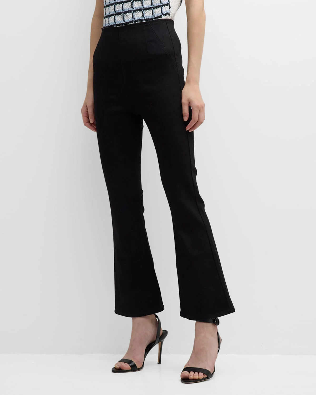 Veronica Beard Jeans "Carson" flared jeans featuring a pintuck front in black denim Approx. 11" rise; 27" inseam; 19" outseam High rise Flat front Side slip pockets Fitted through the hip and thighs Cropped length Pullon style Polyester/cotton/elastane Machine wash cold Imported