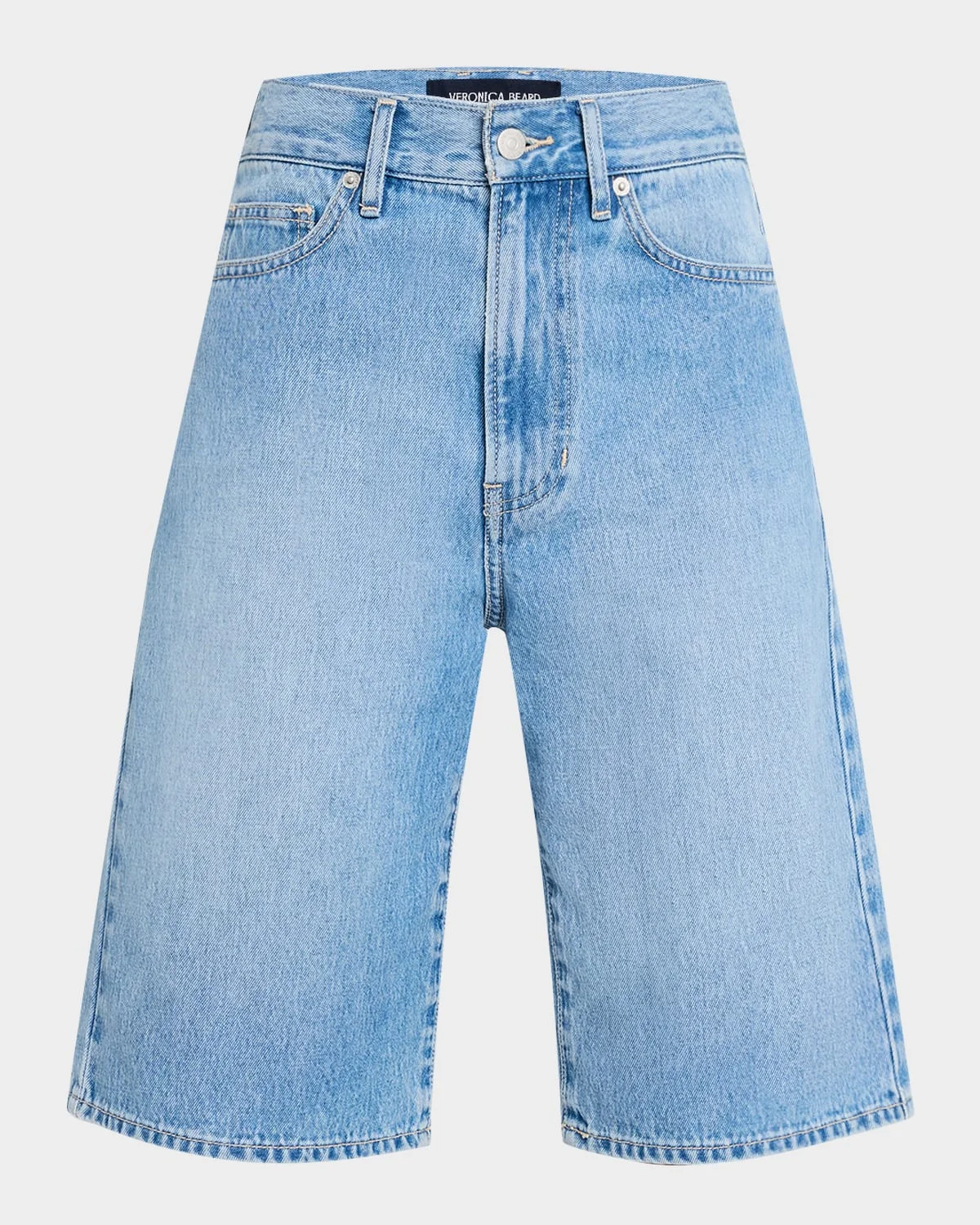 - Veronica Beard "Charlotte" long denim shorts - Approx. 12.5" inseam - High rise - Five-pocket style - Straight legs - Knee-length - Button/zip fly; belt loops - Cotton - Unlined - Machine wash cold - Imported