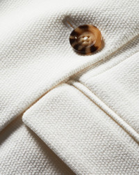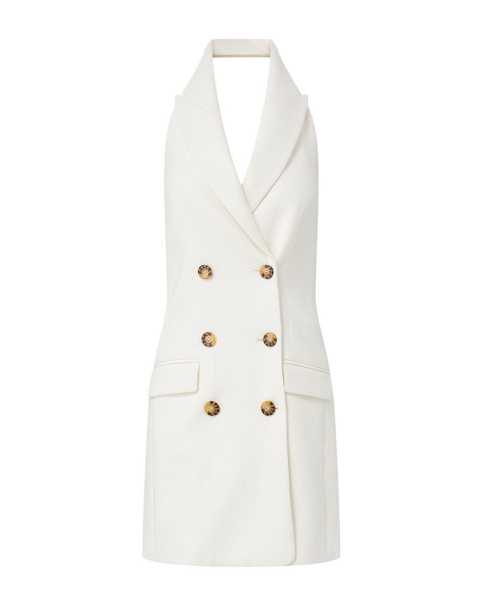 Chic, modern, minimalist—the Claridge dress is everything you love about a blazer, in a dress. Tailored to perfection from an Italian-made, textured cotton blend, it features a halter neckline with peak lapel and a nipped-in waist. Decorative flap pockets and tortoise buttons mimic classic double-breasted styles, while a hidden front zipper keeps it secure. Complete the look with mules and a Veronica Beard Goody Bag. DETAILS & FIT - 97% cotton, 3” spandex - Lining: 96% polyester 4% elastane - Length 33.5", based on a size 2 - Our model is 5'10" and is wearing a size 2 - Fabric country of origin: Italy - Professional dry clean only - Style #2404SU7121132