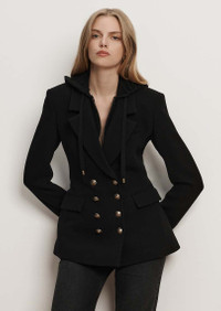 Product details Meet Claude, our newest double-breasted blazer silhouette. Expertly crafted from an Italian virgin wool blend, it features a slim fit, nipped at the waist for definition. An exaggerated lapel with a low breakpoint completes the look, creating a modern, elongating finish. Style this black jacket with jeans, ankle boots, and your favorite dickey for a classic VB uniform. - 96% Virgin Wool, 4% Elastane - Lining: 100% Cupro - Fabric country of origin: Italy - Dry clean only - Style #2511TW12111445
