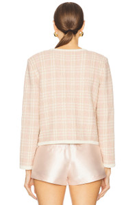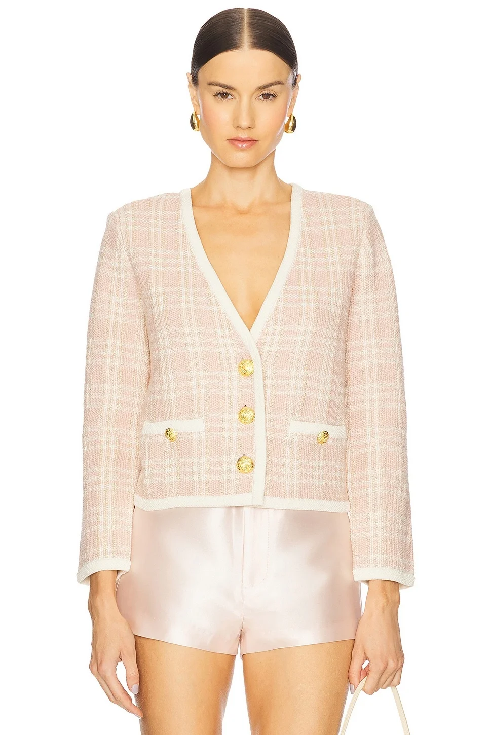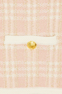 - 75% cotton 12% polyester 6% nylon 6% metallic 1% elastane - Dry clean only - Front button closure - Front buttoned pockets - Gold-tone hardware button - Midweight knit fabric with padded shoulders - Revolve Style No. VBRD-WO197 - Manufacturer Style No. 2502KC1290483