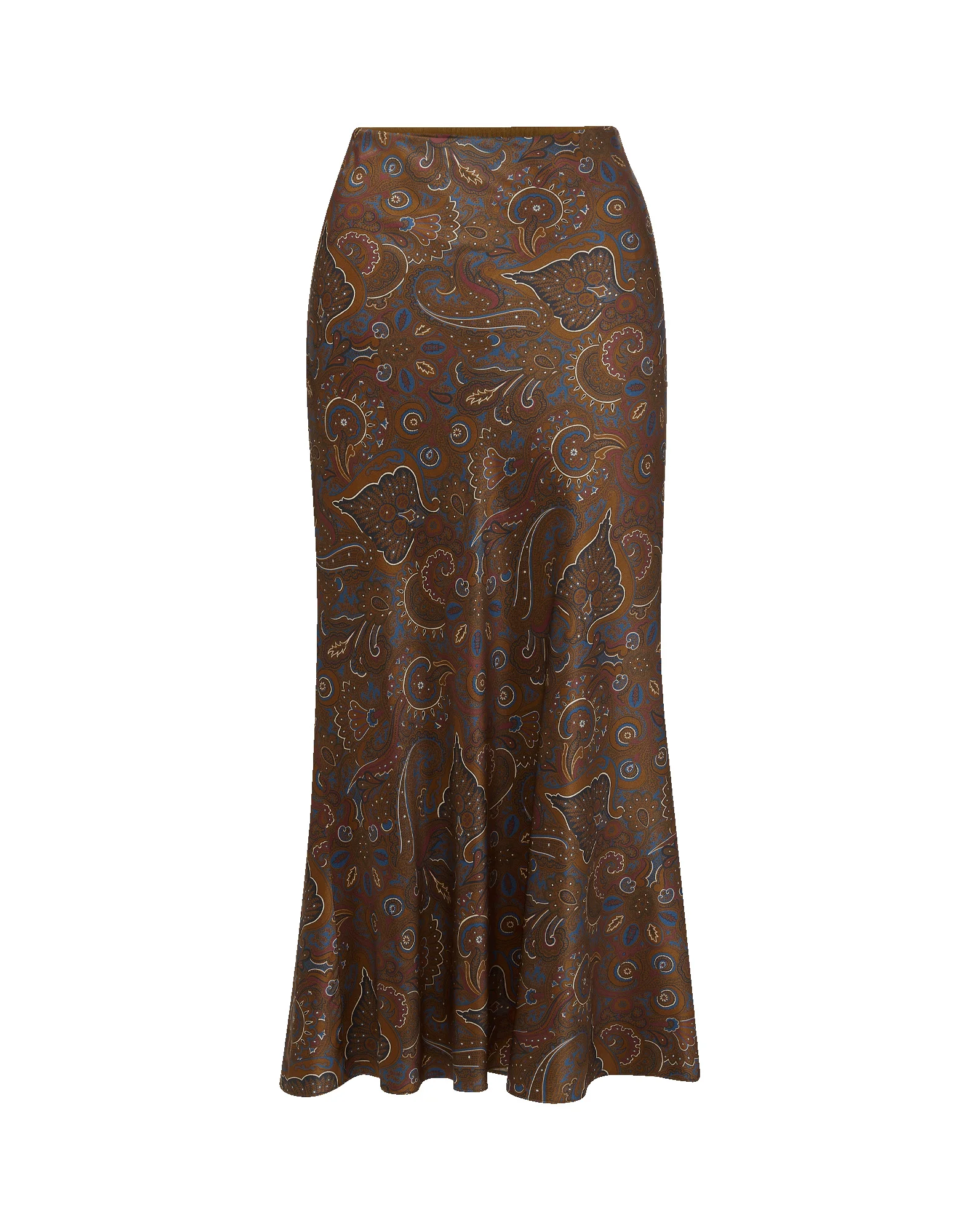 Product details The slip skirt every wardrobe needs. Crafted from a premium silk-stretch blend, the Clover midi skirt falls to the mid-calf with fluid, easy movement. Featuring a warm brown paisley print, it’s the piece you’ll reach for all season long. Style with a cashmere sweater and tall boots for an elevated layered look. - 53% Silk, 35% Viscose, 12% Elastane - Dry clean only - Style #2511FL5630374
