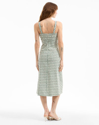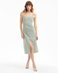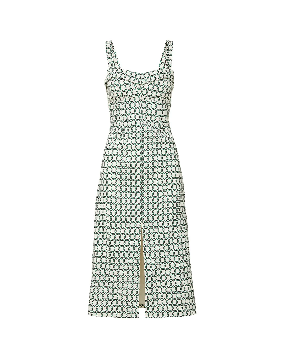 Product details Expertly tailored from premium stretch linen, the Colleen midi dress is designed to flatter with its close-fitting sheath silhouette. The sweetheart neckline adds charm while the adjustable straps and front slit offers comfort and ease of movement. Finished with a graphic link print in vibrant green, this pairs well with pointy-toe heels and a boxy lady jacket—polished perfection. - 55% Linen, 42% Viscose, 3% Elastane - Lining: 100% Polyester - Dry clean only - Style #2505LN3220855