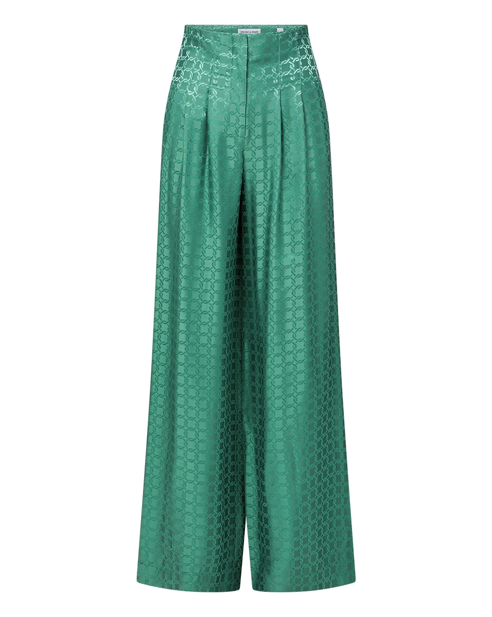 Product details The chicest—and most comfortable—pants you’ll own this spring. Crafted from a luxe silk-viscose blend in vibrant green with a tonal chain print, this fluid high-rise, wide-leg pant features a flattering Hollywood waistband for an elongating effect. Front pleats, side slant pockets, and back welt pockets complete the look. For a polished yet effortless spring set, pair with the coordinating Issel jacket—or tuck in a simple tee or tank top for a more laid-back look. - 74% Viscose, 26% Silk - Unlined - Dry clean only - Style #2505JQ1660617