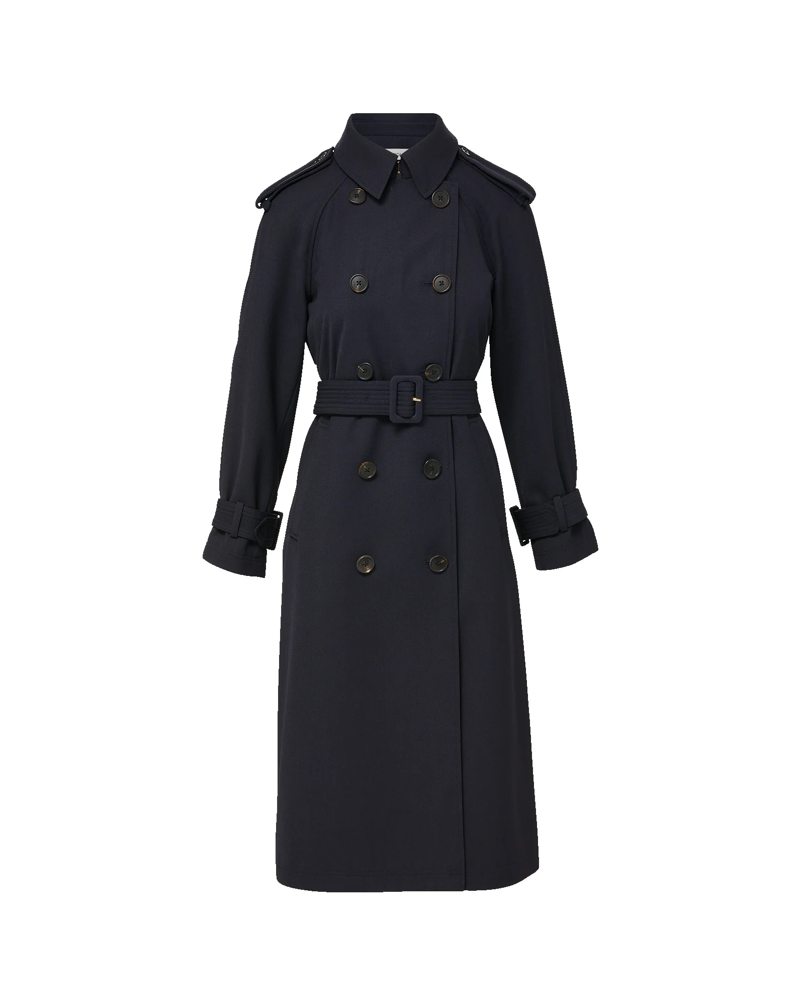 Product details Equal parts utility and sophistication, the navy Conneley trench coat is made in the US from a premium stretch wool. Everything else you love about a traditional trench remains the same—the double-breasted silhouette, epaulettes, storm gun, and a waist-defining removable belt. Plus, it's dickey compatible for endless styling options. - 55% Polyester, 45% Virgin Wool - Lining: 100% Viscose - Made in USA - Dry clean only (no trichloroethylene). Iron on low. - Style #2507OW11070252