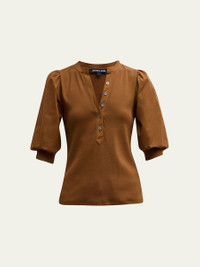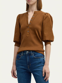 Veronica Beard Jeans "Coralee" knit top featuring short puffed sleeves V neckline Easy fit Hem sits at the hip Half button-front Cotton/elastane Machine wash cold Imported Online Inquiries: BGS21_T90YZ| Store Inquiries: #4651800