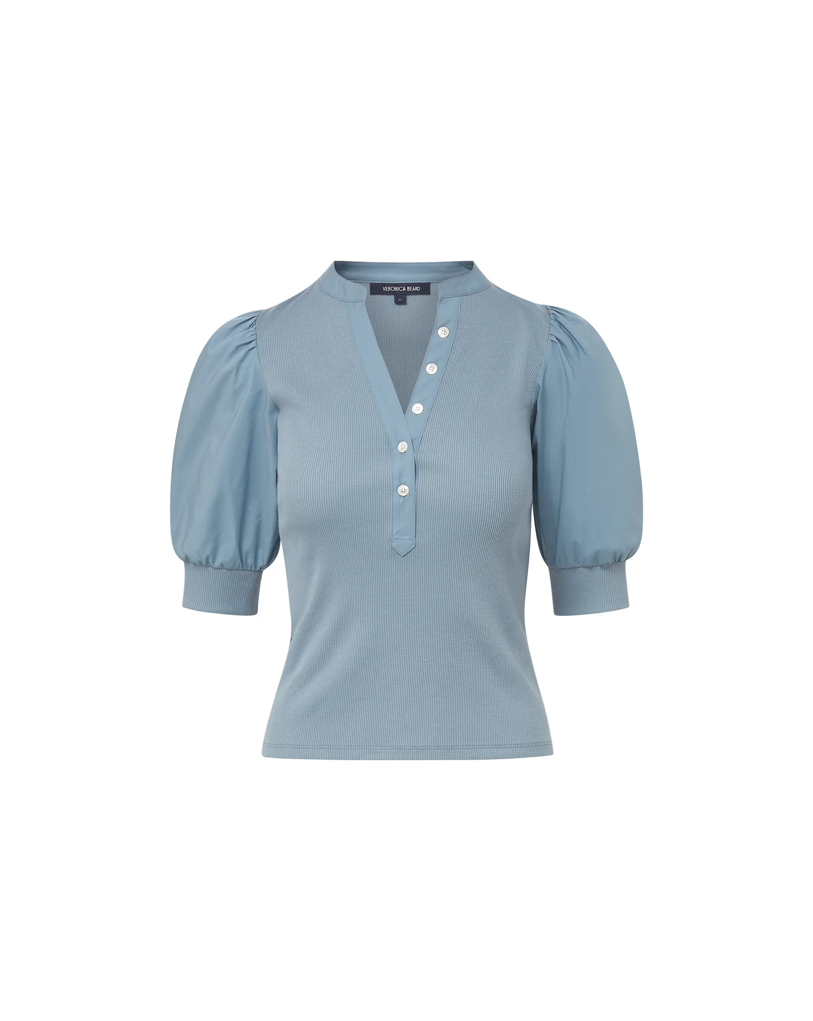 Product details Meet the Coralee tee, our feminine take on the classic henley t-shirt. Elbow-length puffed sleeves exude soft romance while a relaxed fit and shortened five-button placket add an ease. Consider this light blue top a new favorite go-to—equally great on its own or as a layering essential. Wear with jeans and sneakers or dress it up with a denim mini, blazer, and heels. - 96% Cotton, 4% Elastane - Turn inside out and machine wash cold. Lay flat to dry. - Style #J2506JY1520831