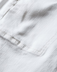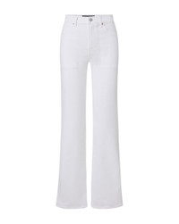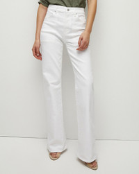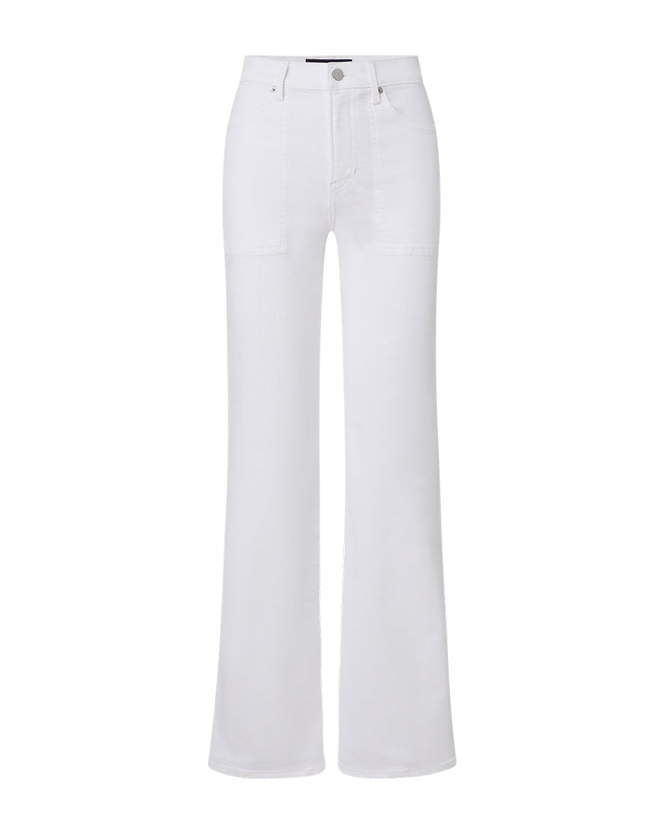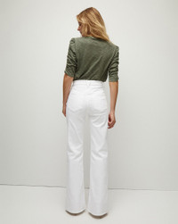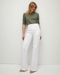 Updated in clean white, our elongating Crosbie jeans feature a flattering high-rise, patch pockets and wide-leg silhouette that is forever chic. We love pairing this sophisticated pair with a simple top and platform heels. DETAILS & FIT - 91% Cotton, 7% Polyester, 2% Polyurethane - Rise 11" | Inseam 34" | Leg opening 21", based on a size 26 - Our model is 5'10" and is wearing a size 26 - Made in LA - Turn inside out and machine wash on cold - Style #J24024460827WH - Rigid - Comfort Stretch - Stretch