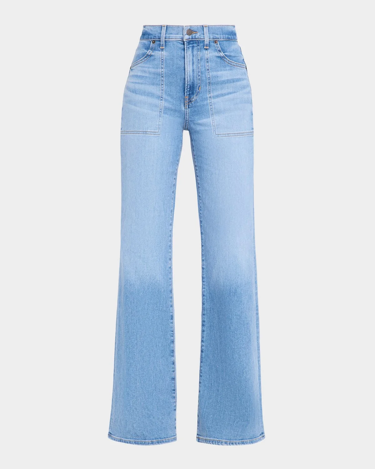 Veronica Beard Jeans "Crosbie" jeans in medium wash denim with topstitching at the pockets Approx. 34" inseam High rise Side patch pockets Wide legs Full length Button/zip fly; belt loops Cotton/elastane Machine wash line dry Made in USA from imported materials