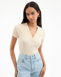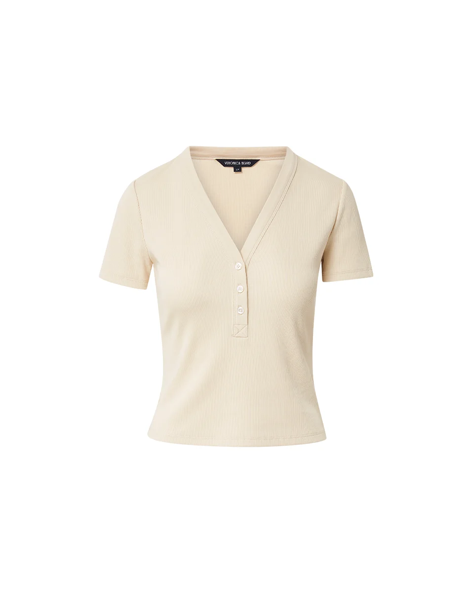 Product details The short-sleeve henley, perfected. Made from stretch cotton for added comfort, the brown Dekalb top features a slim ribbed fit, a deep V-neck, and a half placket. A great layering piece for work, weekend, and beyond, it's endlessly versatile. Wear with jeans, a mini, under a blazer... this t-shirt is a great everyday go-to. - 96% Cotton, 4% Elastane - Turn inside out and machine wash cold. Lay flat to dry. - Style #J2504JY152T0447