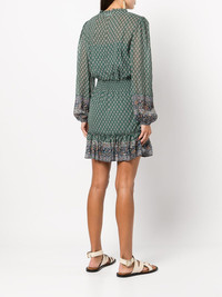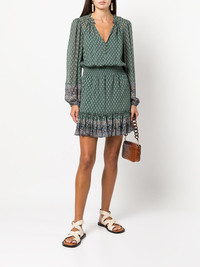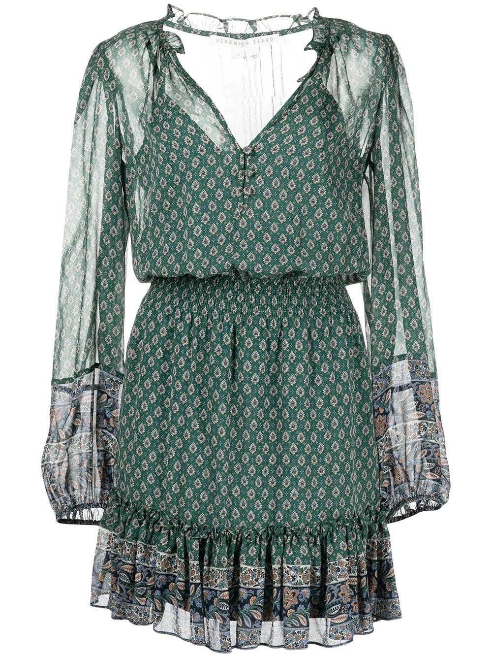 Destiny print dress Destiny print dress from VERONICA BEARD featuring green, multicolour, silk, all-over graphic print, self-tie fastening, shirred panel, V-neck, button fastening, ruffle hem and thigh-length. Imported Composition Silk 100% SIZE & FIT Model measurements Height 5 ft 10 in(1.77 m) Bust/Chest 29.92 in(76 cm) Hips 35.03 in(89 cm) Waist 24.01 in(61 cm) Washing instructions Dry Clean Only