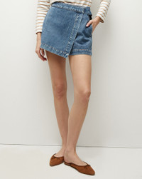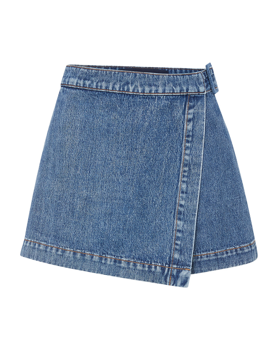 Skirt from the front, shorts from the back. This playful denim skort is made from 100% cotton and features a wrap-front skirt—secured with a matching buckle—concealing the shorts underneath. Wear it with sandals in the summer and boots when the weather cools. DETAILS & FIT - 100% Cotton - Rise 13" | Inseam 3" | Leg opening 26.5", based on a size 2 - Our model is 5'10" and is wearing a size 2 - Turn inside out and machine wash cold. Hang to dry. - Style #J2406D161284WD
