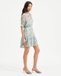 Product details The ultimate in feminine ease. Made from a premium stretch fabrication, the Dorrie mini dress features a tiered skirt, delicate allover pleating, and a custom painted shell pattern in pale blue and yellow. Romantic details include shirring at the cuffs and tight ruffles at the neckline and skirt. A thin sash, with faux baroque-pearl charms, lets you define the waist or wear it relaxed. Dress it down with sneakers or up with kitten-heel sandals. - 100% Polyester - Lining: 100% Polyester - Dry clean only - Style #2505CF1421911
