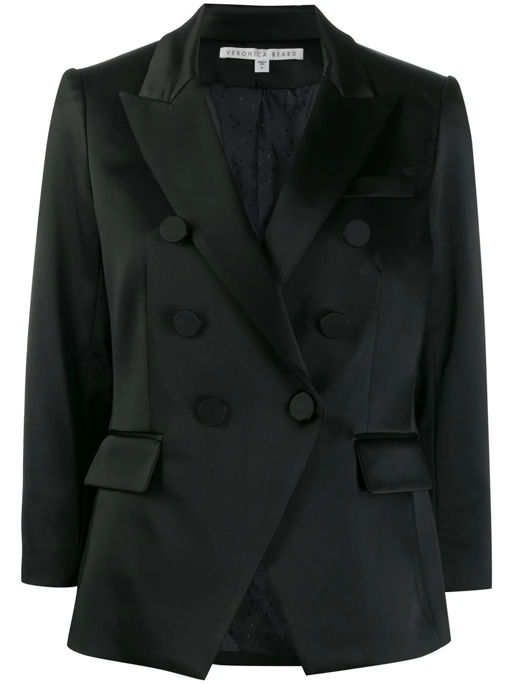 double breasted blazer Black double breasted blazer from Veronica Beard featuring peaked lapels, a double breasted front fastening, front flap pockets, a fitted silhouette, long sleeves, button cuffs and a rear central vent. Made in United States Composition Outer: Acetate 48%, Polyamide 45%, other fibers 7% Lining: Polyester 100% SIZE & FIT Model measurements Height 5 ft 9 in(1.74 m) Bust/Chest 32.28 in(82 cm) Hips 35.82 in(91 cm) Waist 24.01 in(61 cm) FittingInformation This piece fits true to size. We recommend you get your regular size Cut for a slim fit Made with a mid-weight non-stretch fabric Washing instructions Dry Clean Only