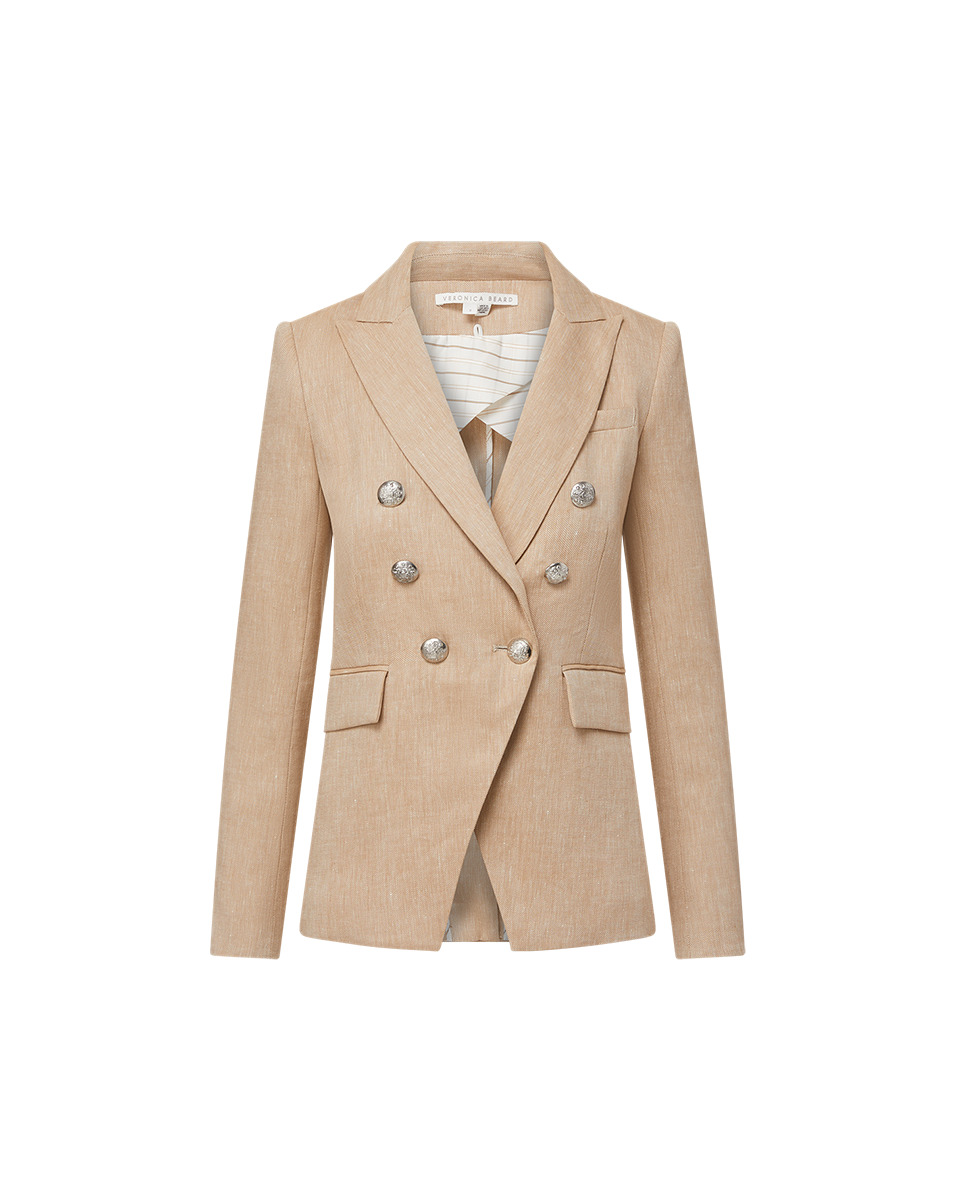 Product details Meet our latest Miller jacket—now updated for warmer weather. Made here in the US, in a stretch-linen blend, this refined and yet lightweight piece will pull all your looks together with ease. Plus, the gold crest buttons give the jacket a polished finish. Throw it over your favorite summer dress for the perfect day-to-night ensemble. - 58% Linen, 27% Polyester, 14% Viscose, 1% Elastane - Lined - Made in USA - Professional dry-clean only - Style #CORELN141492