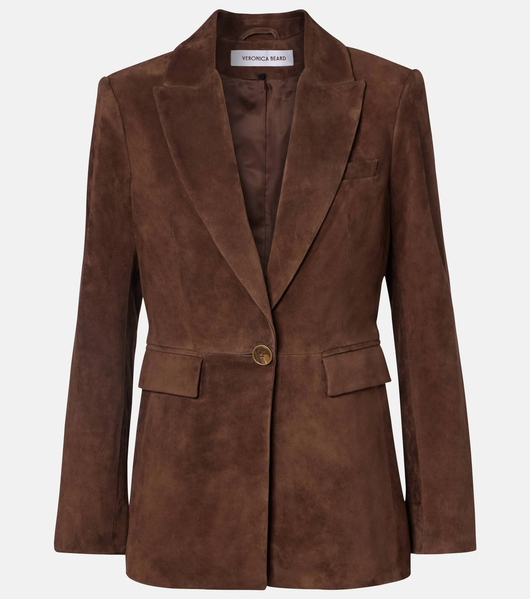 Veronica Beard's low-effort, high-impact separates find the perfect balance between casual and chic. The Duane blazer is crafted from supple suede and is complete with classic peak lapels. Product Details - Material: 100% lamb leather (suede) - Care instructions: specialist clean - Made in China - Designer color name: Mocha - Item color: brown - Peak lapel - Pockets: flap pockets - Closure: single-breasted (one button) - Vent: single - Item number: P01096290 Size & Fit - True to size - Shoulder pad inserts - Cinched waist - Non-stretchy fabric - Falls below the hip - The model seen in the picture is 178cm-5'10" and wearing a size US 4