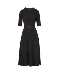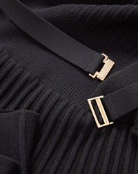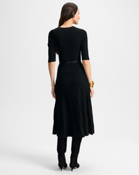 Product details A sleek staple every closet needs. Crafted from a soft-ribbed knit blend, the Elthea half-sleeve midi dress is fitted at the bodice before flowing into an A-line skirt for a clean, elongating silhouette. An attached belt finished with a gold clasp buckle gently cinches the waist for timeless polish and flattering shape. Pair with tall boots for a layered look or strappy heels for an elegant finish. - 83% Viscose, 17% Polyester - Dry clean only - Style #2508KS1221628