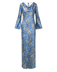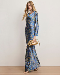 Product details Spun from a luxe silk blend, the Ember dress drapes beautifully for an elegant, flowing silhouette. Featuring a paisley floral pattern set in soft blue, this sweeping maxi is designed with a cowl neckline, long flared sleeves, and a deep V-back with a self-tie closure. Incredibly chic, it’s the dress you’ll reach for when the RSVPs start rolling in—just add a strappy heel and go. - 53% Silk, 35% Viscose, 12% Elastane - Lining: 100% Polyester - Dry clean only - Style #2602FL5622397