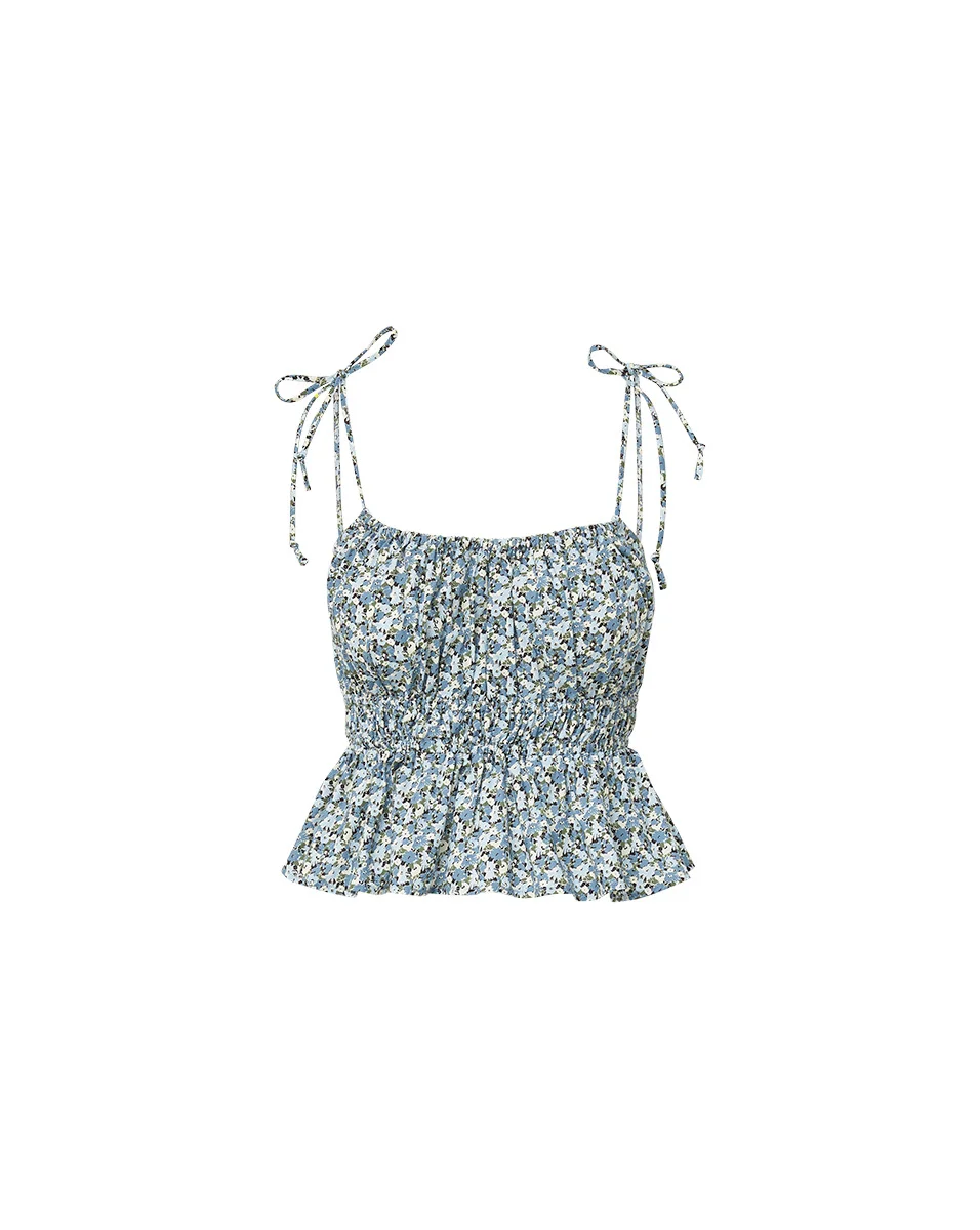 Product details Pretty, please. Made from stretch cotton voile, the Erving tank top features a cinched, shirred empire waist, a ruffled peplum, and a romantic garden print in pale blue. Adjustable spaghetti straps complete the look. Wear it solo or layered under a jacket for extra polish—it's a standout top for both day and night. - 60% Cotton, 40% Viscose - Lining: 100% Cotton - Dry clean only - Style #J2505VO2741328