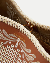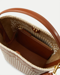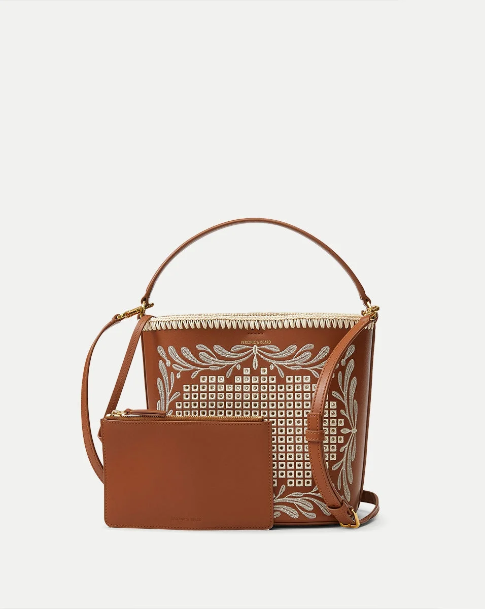 Product details The chic and streamlined Feedbag you know and love, now crafted in polished fine-grained leather with cotton wax cord eyelets, embroidery, and whipstitched edge. This compact style is finished with both a structured top handle and a removable shoulder strap for maximum versatility. This embroidered bucket bag features an interior zip pouch and V-shaped hook-and-eye closure ensure convenience and ease. - 75% Leather, 25% Polyurethane Laminate - Lining: 100% Polyester - Trim: 100% Cotton - 9.8" L x 5.9” W x 7.9” H - Handle drop: 5.5”; strap drop: 20.1” - Store in a cool, dry place and wipe any surface dirt with a dry cloth. To preserve the leather’s finish, avoid rough surfaces. If wet, gently blot with a microfiber cloth. - Style #H2505HL304X176