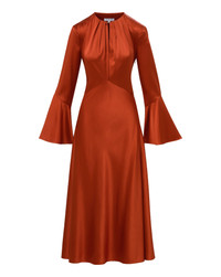 Product details Designed to turn heads. Crafted from a sleek silk-blend satin in bold carnelian red, the Ezri dress features an ankle-length A-line silhouette—bias cut for beautiful drape—with a V-shaped waist seam for a body-skimming fit. A pleated crew neckline, long, fluttering circle sleeves, and a front keyhole clasp complete the look. Style this red dress with a simple heel and clutch for your next dinner or date night. - 53% Silk, 35% Viscose, 12% Elastane - Lining: 100% Polyester - Dry clean only - Style #2511FL5021975